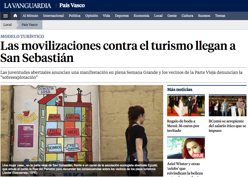 Eguzki.- A raíz de las acciones de denuncia de Arran en Catalunya y la manifestación convocada por Ernai en la Aste Nagusia, algunos están sumamente interesados en vender la burra de la “turismofobia nacionalista”, y más de un medio de comunicación desplazó la semana pasada equipos a la Parte Vieja donostiarra para recoger “pruebas gráficas” de tal perversión. Pero la realidad no daba para mucho… “Aquí no hay más que cuatro pintadas pequeñitas con rotulador”, comunicaba el jueves por teléfono a la redacción un reportero, mientras su cámara, aburrido, aguardaba indicaciones. Seguramente por eso, o sea, porque no había nada mejor que llevarse al objetivo de la cámara, un modesto mural de Eguzki, que denuncia en clave de humor el problema de los apartamentos turísticos, ha obtenido un sorprendente eco. Por ejemplo, en La Vanguardia servía para ilustrar a lo grande una información titulada “Las movilizaciones contra el turismo llegan a San Sebastián”, y el pie de foto decía así: “Una mujer pasa frente a un cartel de la asociación ecologista abertxale (sic) Eguzki…”. Pues bien, esta circunstancia nos “obliga”, casi “por alusiones”, a ordenar unas ideas sobre nuestra posición ante el turismo, tema que nuestra organización ha abordando “desde siempre”, aunque de forma bastante tangencial.