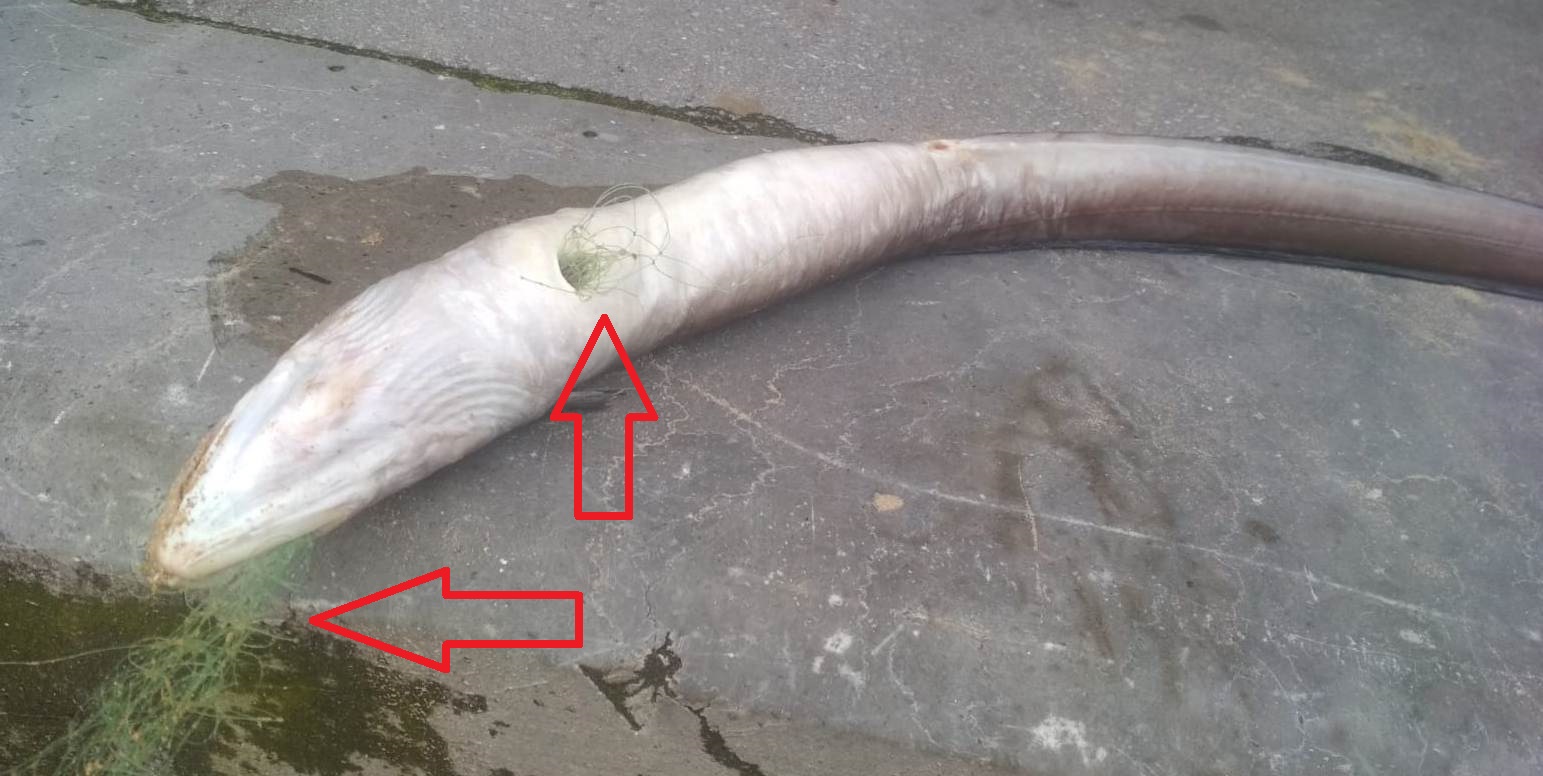 Esto no solo ocurre en el Pacífico y en los "mares de la China", ocurre frente a nuestras casas por la desidia de unos pescadores que arrojan la basura por la borda pensando que el mar se lo traga todo, incluido este pobre congrio.